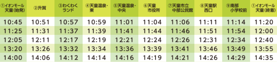 ※乗降地点の何れかがイオンモール天童をご利用頂くお客さま専用のバスです。 ※定員に限りがあるため、満員の際、ご乗車出来ない場合がございます。 ※降雪や交通渋滞等の気象及び道路条件に伴い、発着時間に遅れが生じる場合がございます。 ※諸事情により、告知せずにルート変更や運休になる場合がございますので予めご了承願います。 ※公共マナーを正しくお守り下さい。