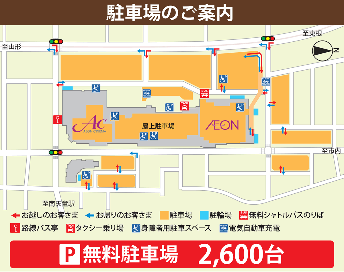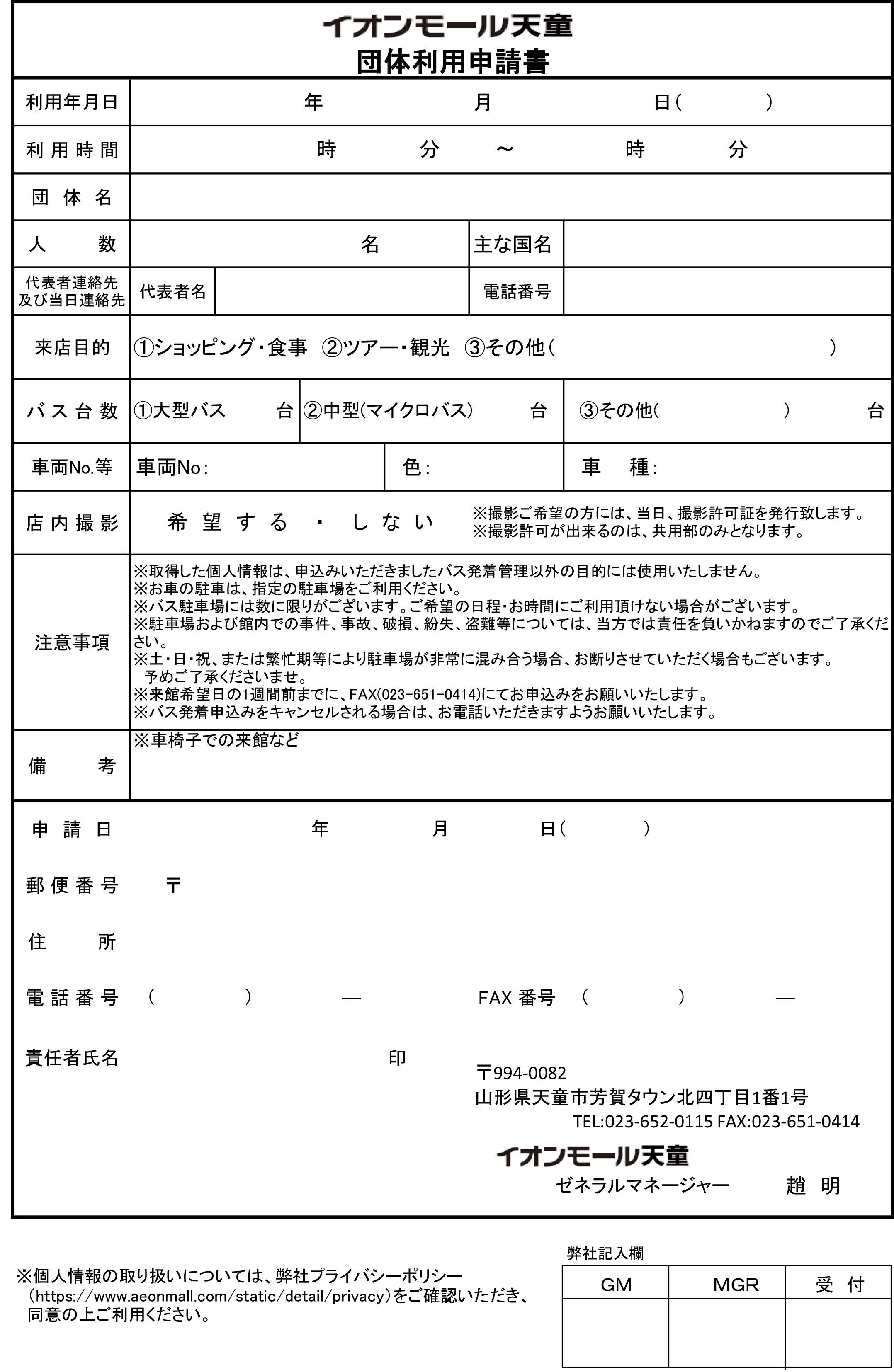 ※ご来館予定日の1週間前までに申請ください。 ※土・日・祝・繁忙期やご予約が重なった場合など、ご希望に添えない場合がございます。 ※周辺道路での駐停車は大変危険です。事前申請のうえご案内の場所をご利用いただきますよう、お願い申し上げます。 ※イオンモール天童近隣は住宅地となっております。駐車場におけるアイドリング等、迷惑行為はお止めください。 ※バス乗降時、駐車場および館内での事件・事故・破損・紛失・盗難などについては当方では責任を負いかねますのでご了承ください。